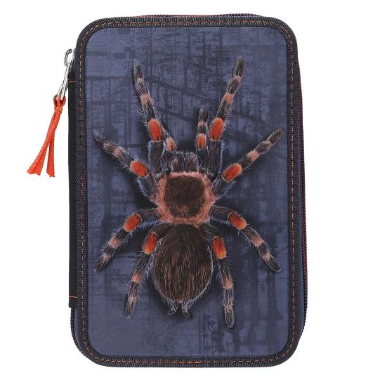 Uau, păianjen! Acest penar albastru închis de la Adventure World prezintă un motiv mare, ușor în relief, cu tarantulă, cu efect 3D pe față. Cele două compartimente separate cu fermoar sunt complet umplute cu 12 creioane colorate, 1 creion, o ascuțitoare cu două capete, o radieră, o riglă, o foarfecă și un lipici stick. Material: 100% poliester