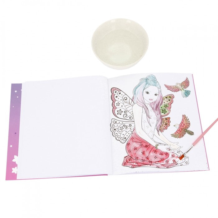 O frumoasă carte de colorat de la TOPModel Fantasy. Pictează doar cu apă și vezi cum apar culorile ca prin magie în imagini. Include o pensulă care poate fi ușor atașată la cartea de colorat, astfel încât să nu dispară.