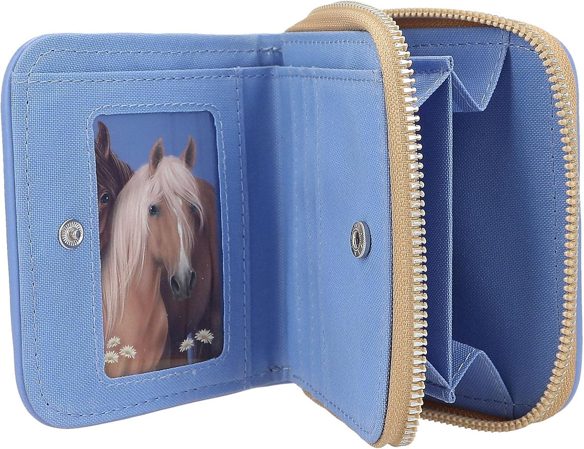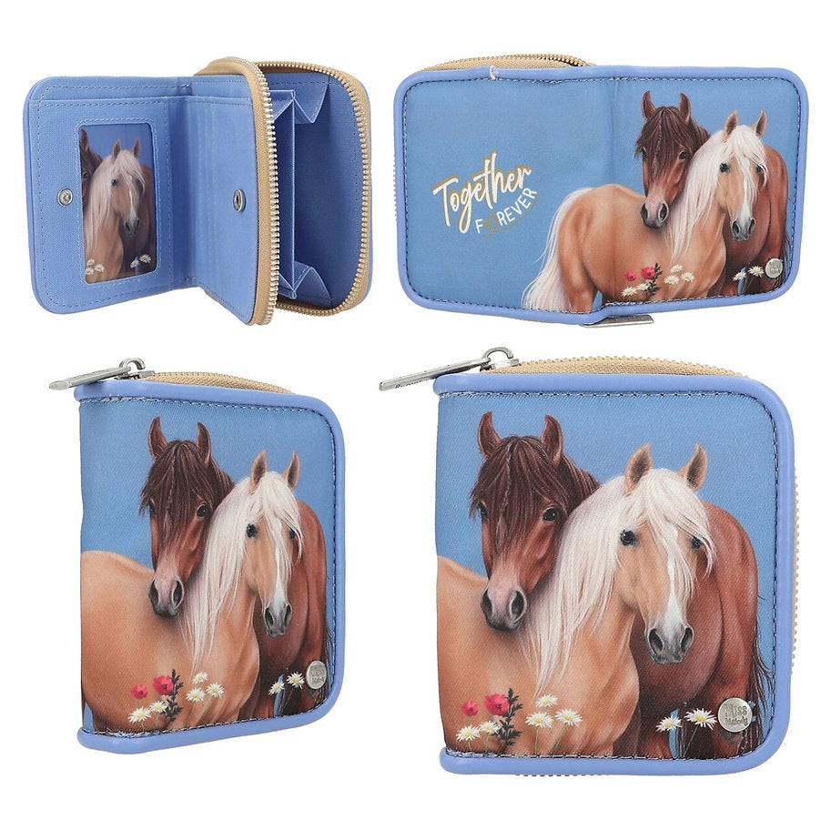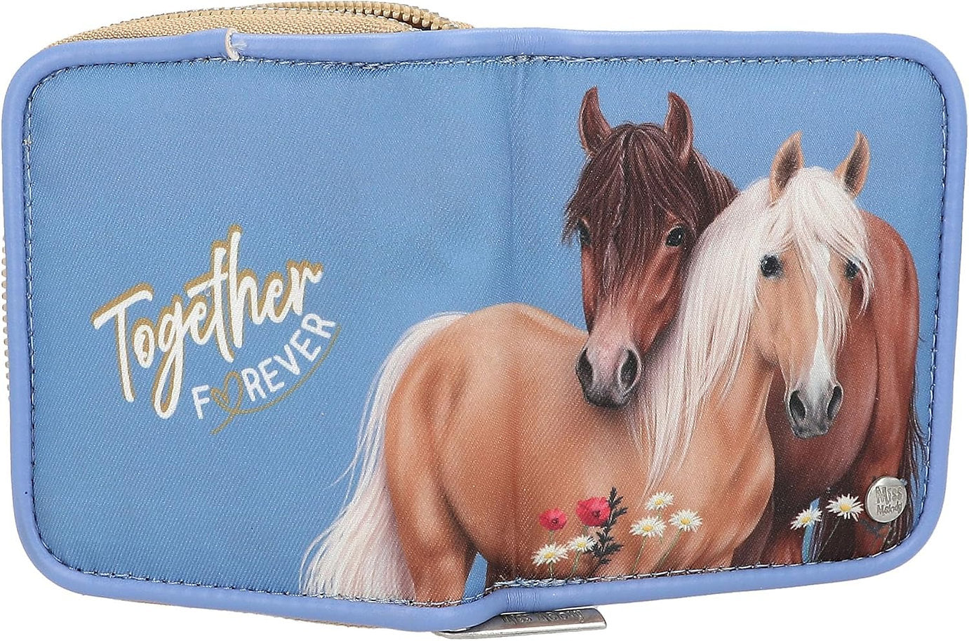 Portofel pentru fete și fani ai cailor cu design Miss Melody de la Depesche - În albastru deschis, cu motiv de cal, flori și inscripția „Împreună pentru totdeauna” Portofelul este prevăzut cu un compartiment cu fermoar pentru monede, un compartiment pentru bancnote și diverse sloturi pentru carduri, inclusiv un compartiment pentru carduri de vizită cu compartiment transparent. Se închide cu capsa si fermoar pentru depozitare și transport în siguranță