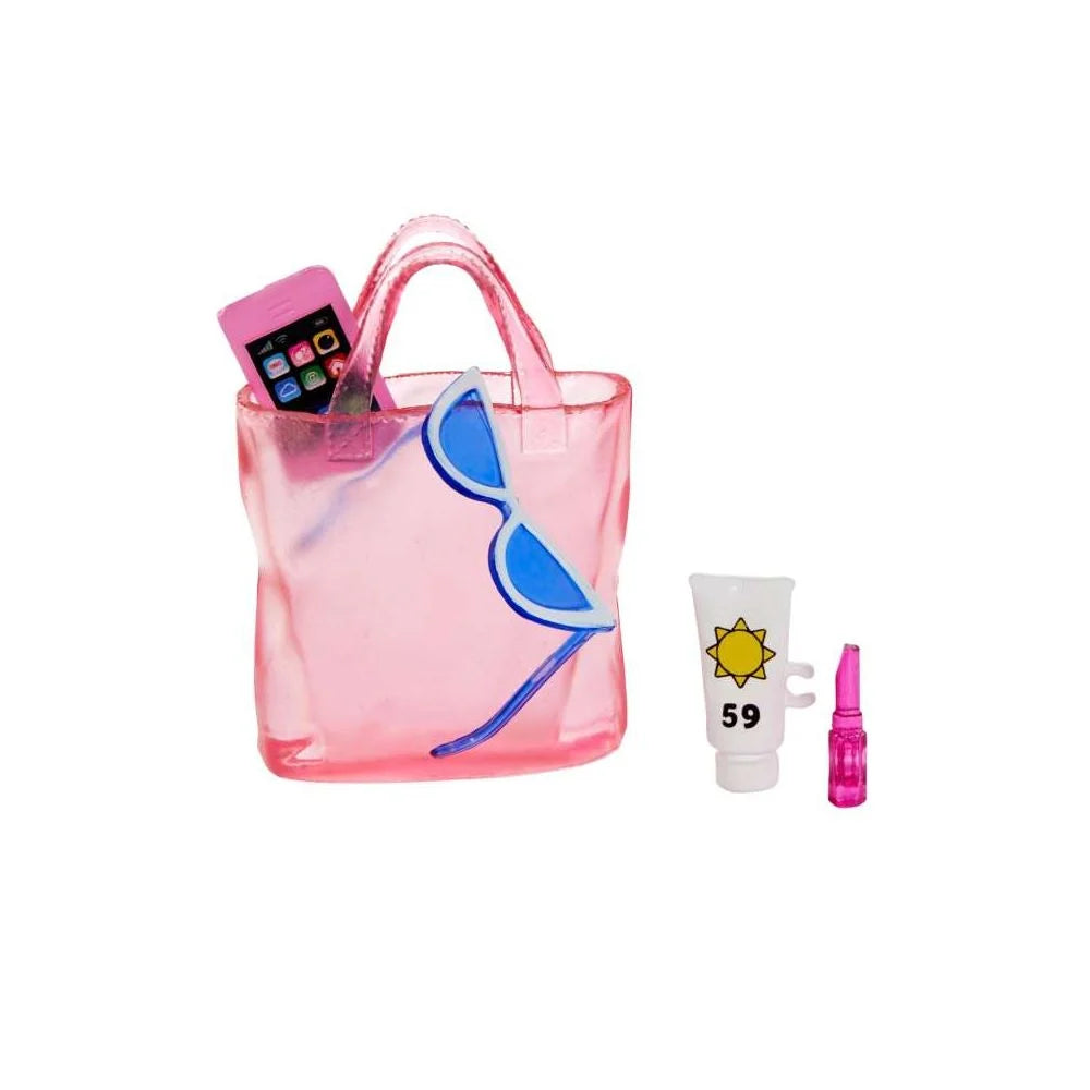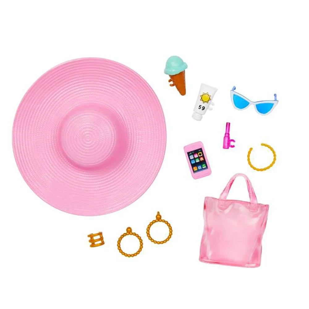 Accesoriile suplimentare includ o palarie, ochelari de soare, un colier auriu si diverse bratari. Geanta roz este perfecta pentru depozitarea protectiei solare, rujului si smartphone-ului. Cornetul de inghetata cu menta se lipeste de mana pentru o pozitie realista.