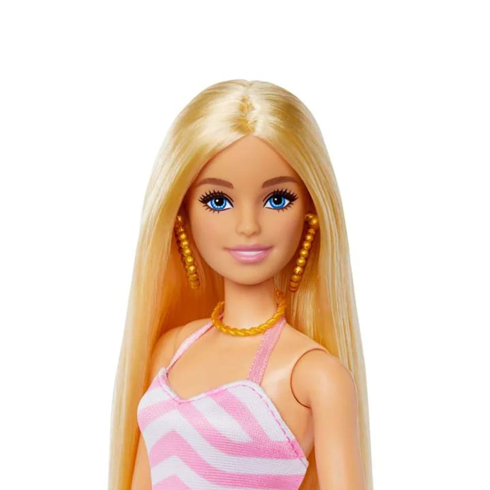 Cu picioarele in nisip si o inghetata in mana, aceasta papusa Barbie are tot ce ii trebuie pentru o zi relaxanta la plaja in Malibu. Poarta un costum de baie roz de vara si o geanta plina cu accesorii de plaja.