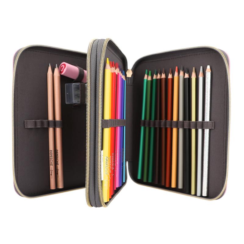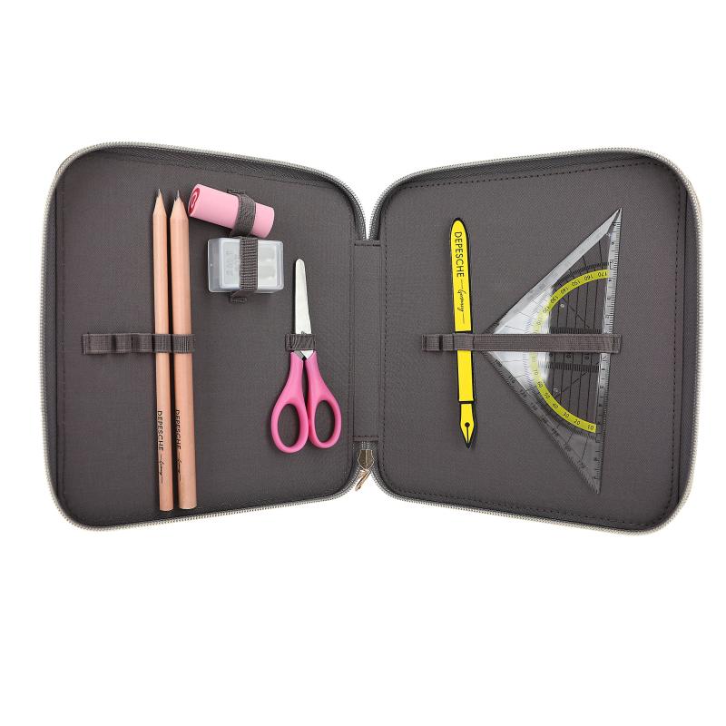 Fantastic de frumos: Penarul roz de la Miss Melody are un model de bandana la moda. In plus: pandantivul inima din piele vegana are un motiv de cal. Cele doua compartimente separate sunt complet echipate cu 24 creioane de colorat, 2 creioane, 1 rigla, 1 foarfece, 1 ascutitoare,1 radiera si un buzunar mic cu scai. Suplimentar: spatii libere pentru propriile instrumente. Material: 100% poliester