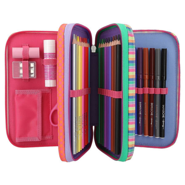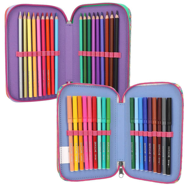 Echipamentul include: o radiera, lipici, un ascutitor, un creion gros si subtire, o rigla, foarfece, 18 creioane si 18 markere.