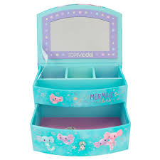Cutie de bijuterii TOPModel cu sirena si axoloți drăguți, în turcoaz strălucitor. Mânerul sertarului este împodobit cu strasuri strălucitoare și o oglindă este ascunsă sub capacul cu balamale.