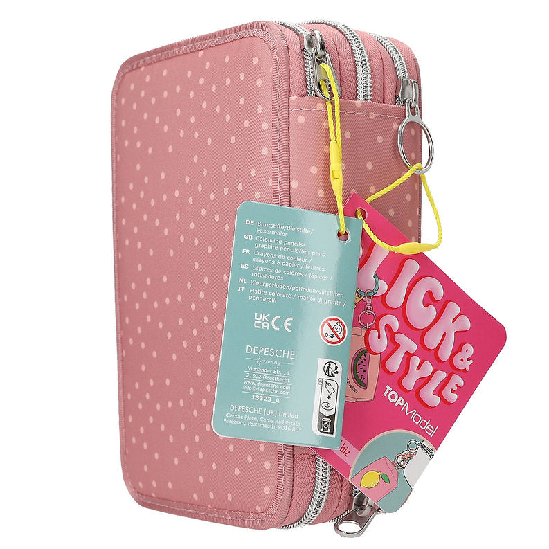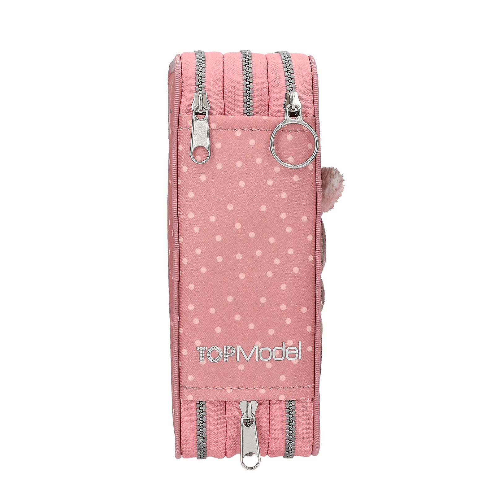 Maimutica extrem de draguta: penarul roz pal cu trei compartimente de la TOPModel prezinta buline portocalii vesele de jur Imprejur si o maimutica elaborat aplicata cu un pui de maimuta pe spate, pe fata. Fructul mic, atasat de o panglica scurta, poate fi strecurat In spatele bratului maimutei, facandu-o sa para ca Il tine In brate. Cele trei compartimente separate sunt fiecare complet echipate cu 18 creioane colorate si carioci, doua creioane, o ascutitoare, o radiera, o rigla, foarfece, un lipici si un zubunar mic cu velcro. Material: 100% poliester